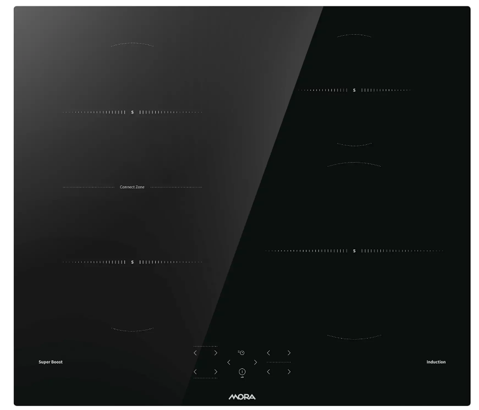 4 indukční varné zóny (2x ø 18 cm, 1,5/2 kW, 1x ø 14,5 cm, 1,2/1,6 kW, 1x ø 23 cm, 1,5/2 kW)