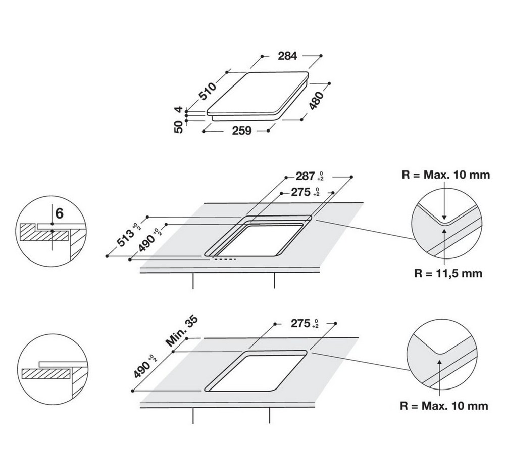 Při instalaci bez trouby na pečení činí minimální požadovaná tloušťka pracovní desky 12 milimetrů, tedy 28 milimetrů v případě instalace nad troubu.