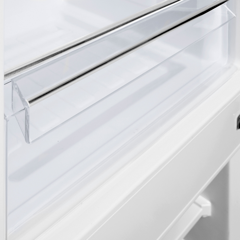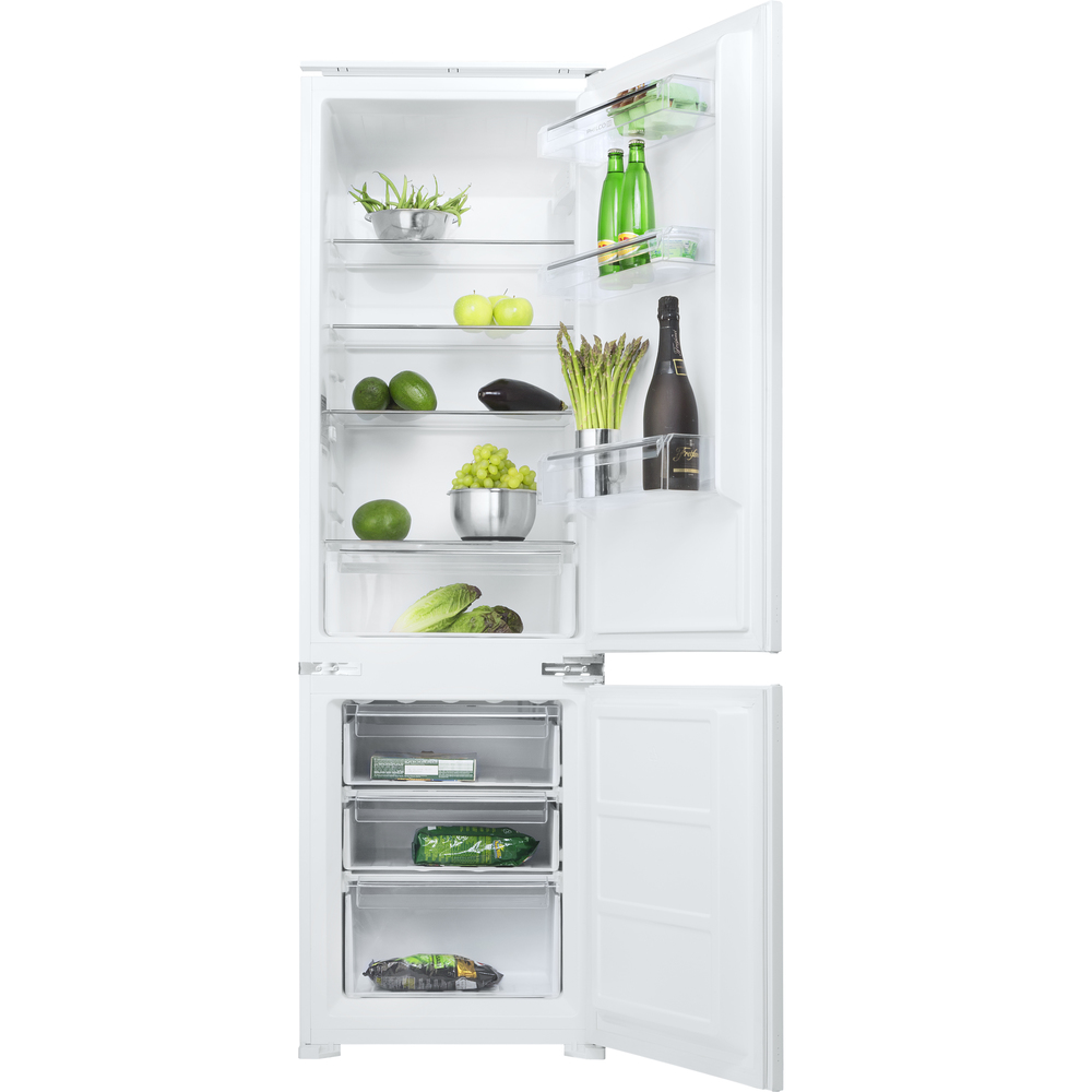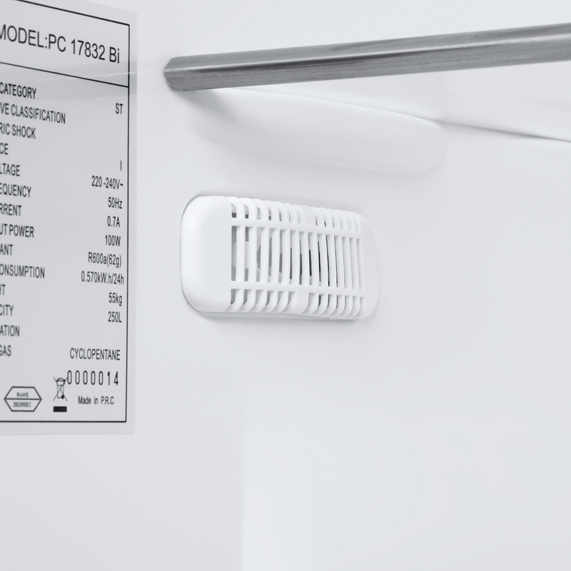 Kombinovaná vestavná chladnička PC17832 Bi o objemu chladící části 179 litrů a mrazicí části 70 litrů v energetické třidě E. Police z bezpečnostního skla vytváří čistý a jednoduchý design.