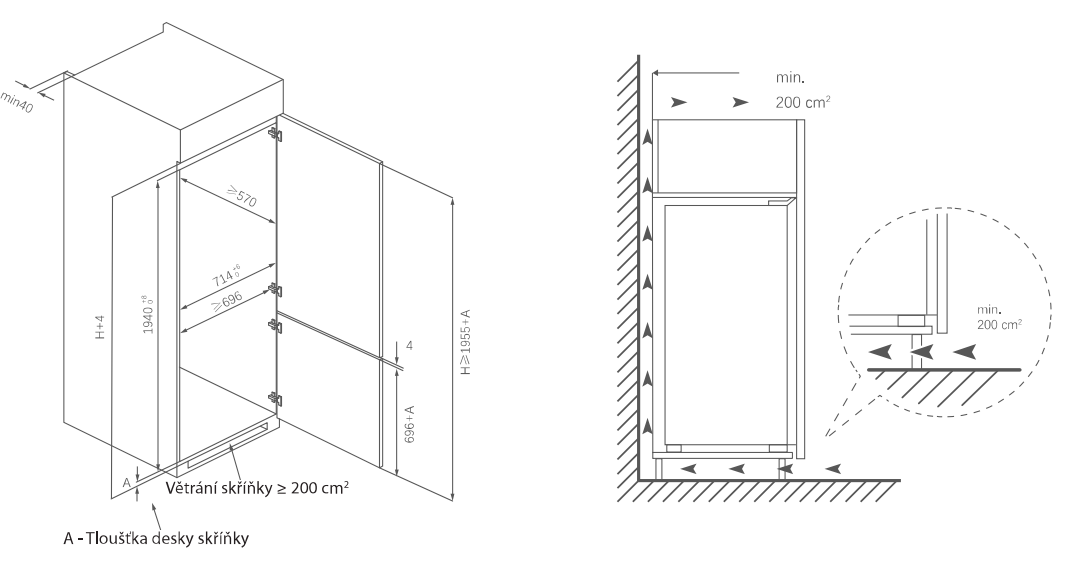 Rozměry pro vestavbu (VxŠxH) 194,8 × 69,6 × 57 cm